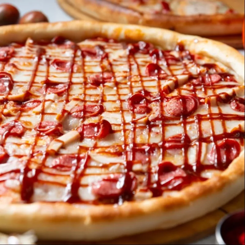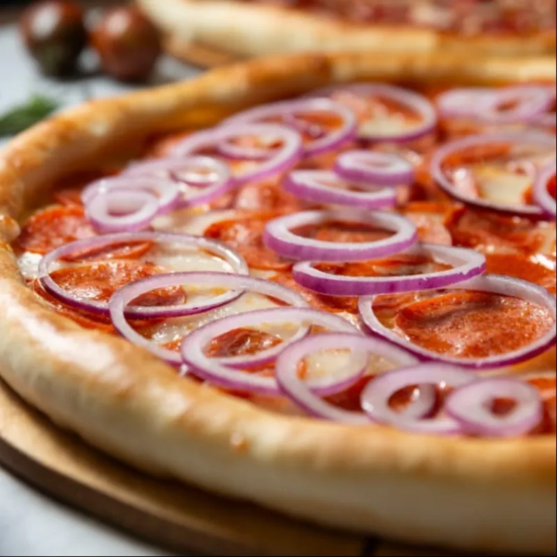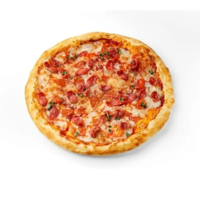 Фирменый соус, сыр Matzarela, 2×Калбаски пеперони ,Красный лук
