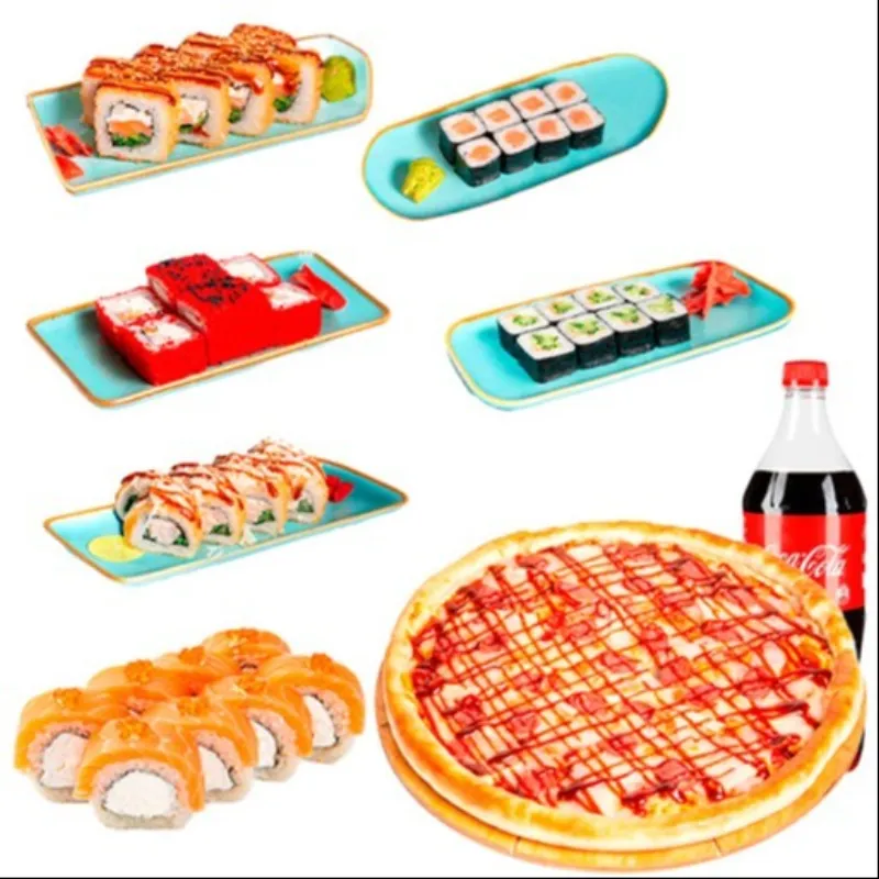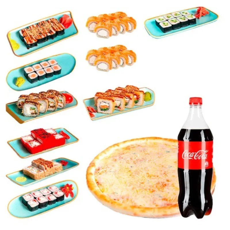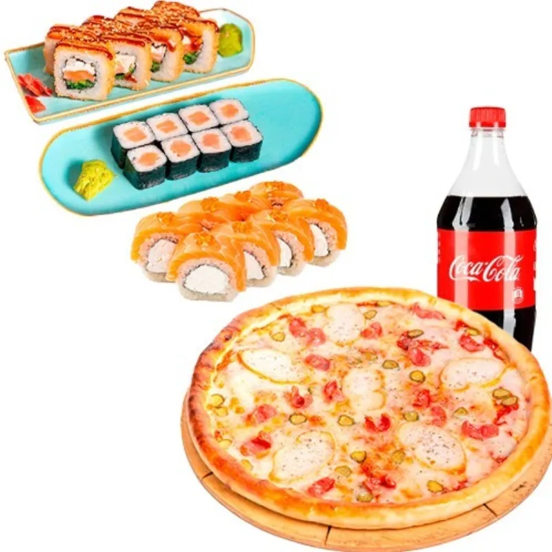 Ролл Филадельфия Премиум 8 шт. ролл Калифорния 8 шт. ролл Америка темпура 8 шт. ролл Цезарь темпура 8 шт. ролл Капа маки 8 шт. ролл Сяке маки 8 шт. Пицца BBQ, Coca-Cola 1 л.
