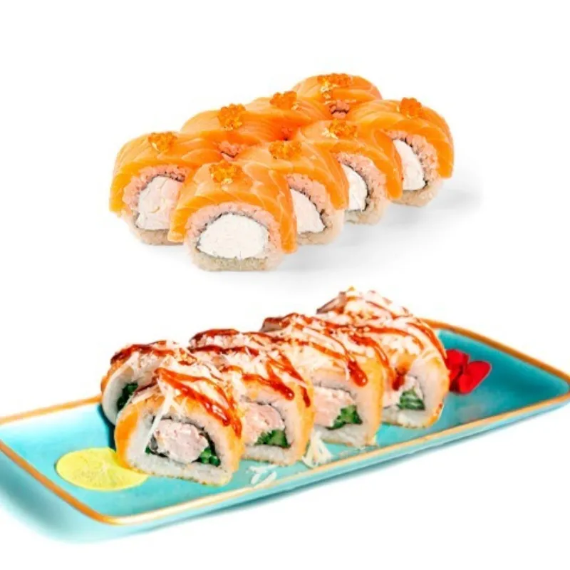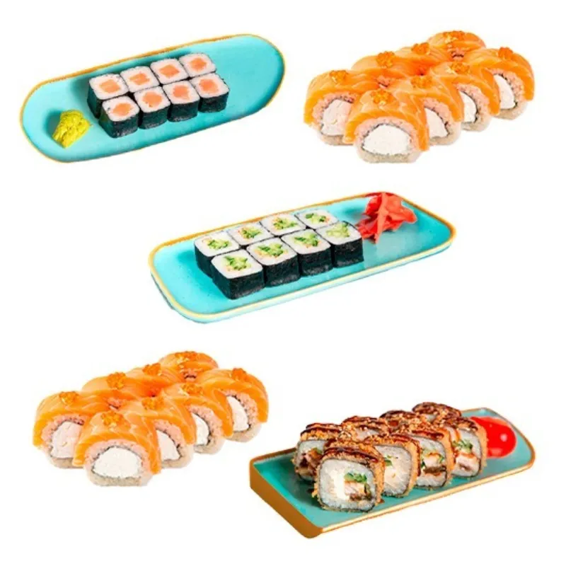Ролл Филадельфия гриль 8 шт. ролл Филадельфия лайт 8 шт. ролл Аляска 8 шт. ролл Америка темпура 8 шт. ролл Унаги темпура 8 шт. ролл Сяке маки 8 шт. ролл Капа маки 8 шт.