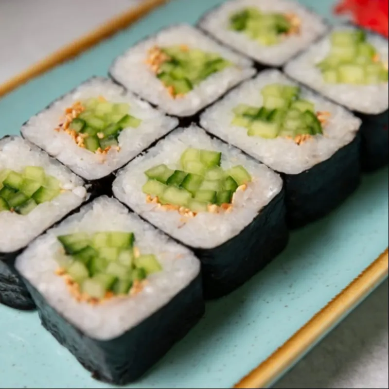 Рис, нори, огурец кружочками сверху, крем чиз, чеддер, соус ясай, спайси соус, соус унаги, черная икра