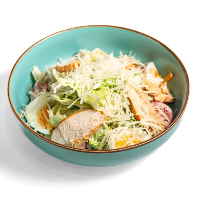 Курица, айсберг, томаты, перепелиное яйцо, соус, пармезан