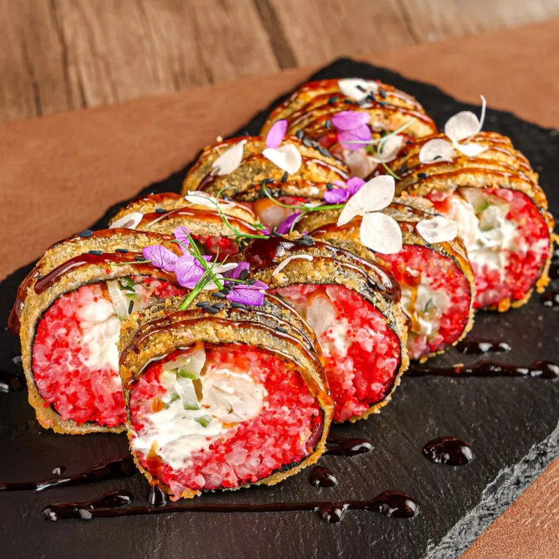 Рис, нори, крем чиз, огурец, креветка темпура, ореховый соус, соус ясай, соус унаги, красная икра, чеддер