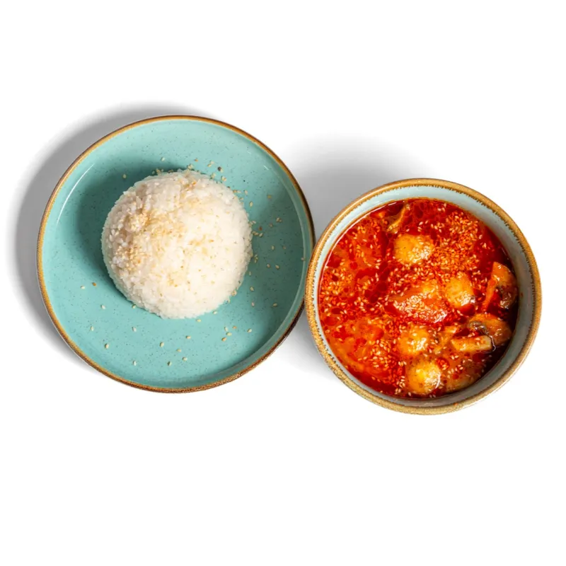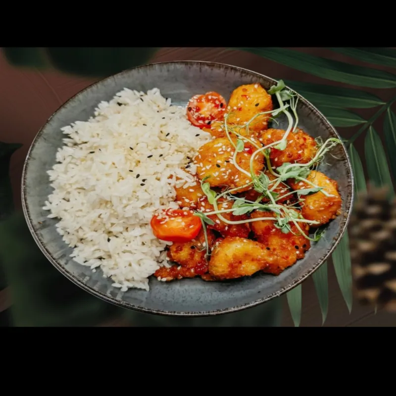 Рис, Творожный сыр, Тигровые криветки, Жареный лук, соус Sweet Chilli