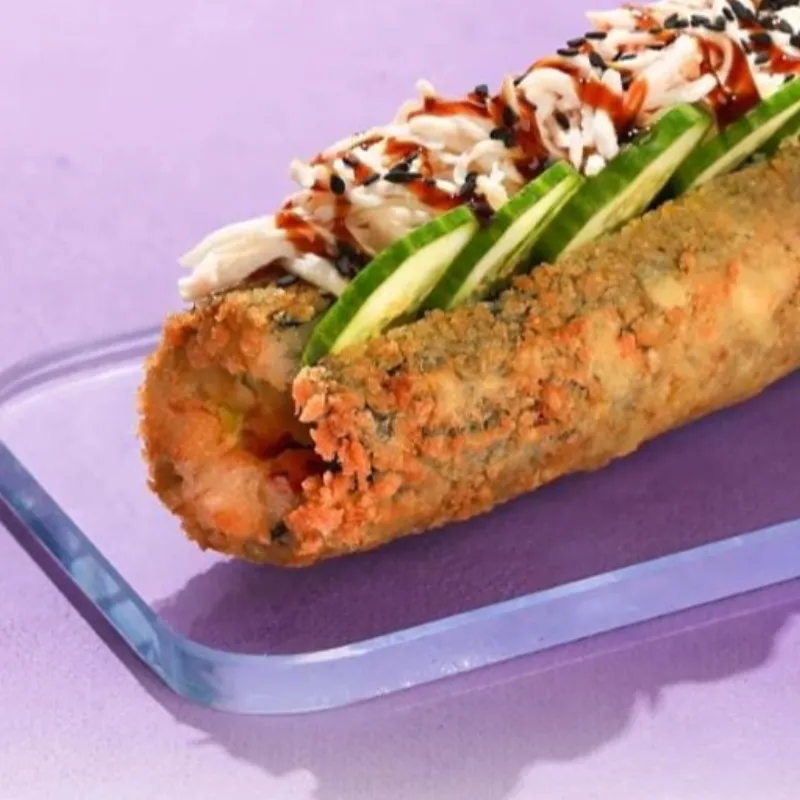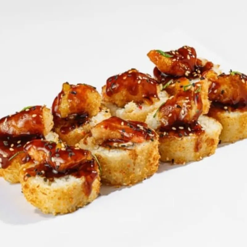 Рис, Творожный сыр, Огурцы, Тигровые криветки, икра летучи рыбы, Жареный лук, соус Sweet Chilli