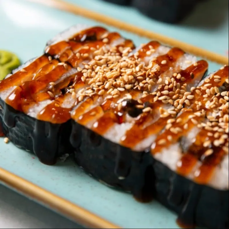 Рис, Творожный сыр, Огурцы, Угорь, соус унаги, кунжут