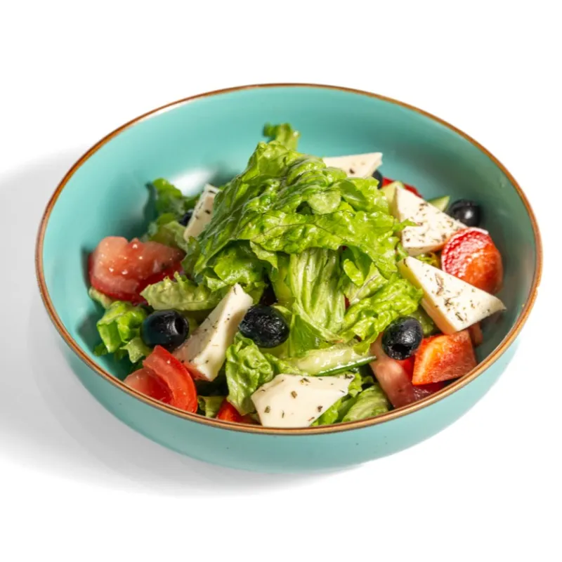 Латук, болгарский перец, свежие огурцы, томаты, маслины, фетакса, оливки, лимонный дрессинг, масло оливковое