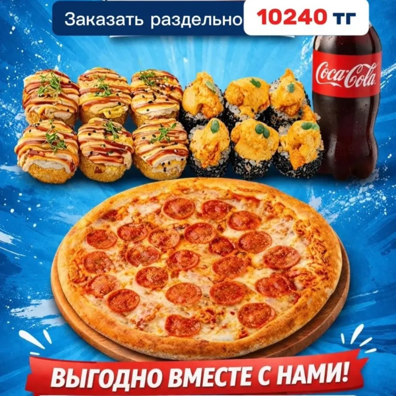 Ролл Аляска запечённая 8 шт. ролл Ясай темпура 8 шт. ролл Америка темпура 8 шт. ролл Унаги Темпура 8 шт. пицца Пеперони 30 см. стрипсы 10 шт. Coca-Cola 1 л.