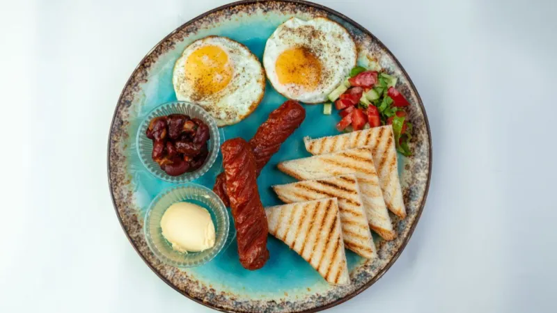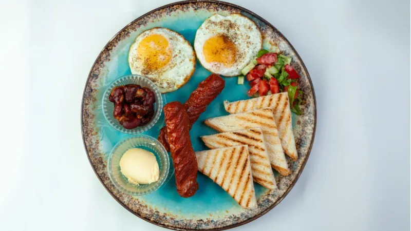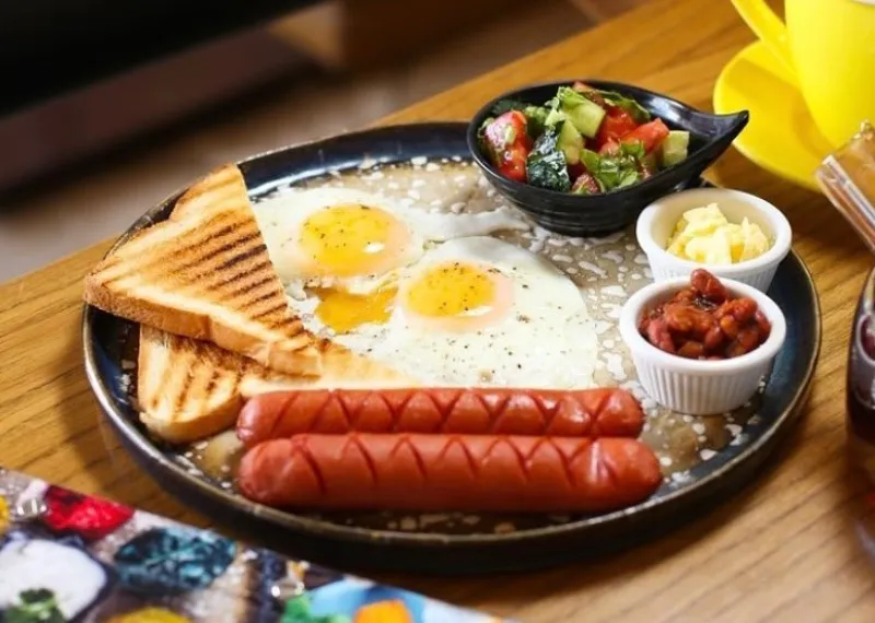 Сосиски, куриные яйца, тост, красная фасоль, шампиньоны, сливочное масло, салат