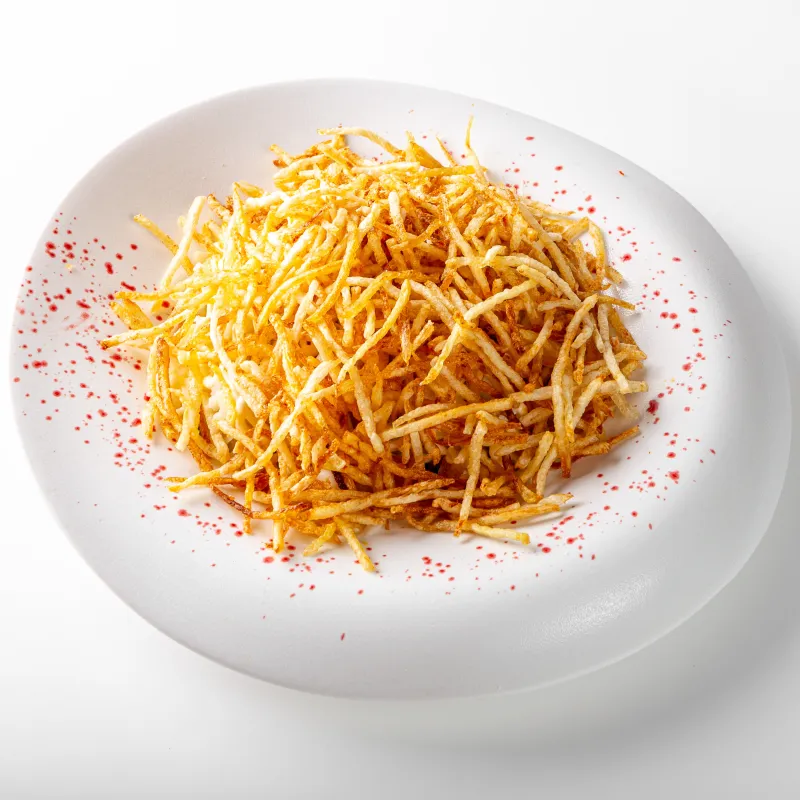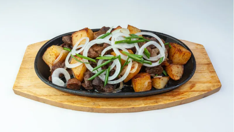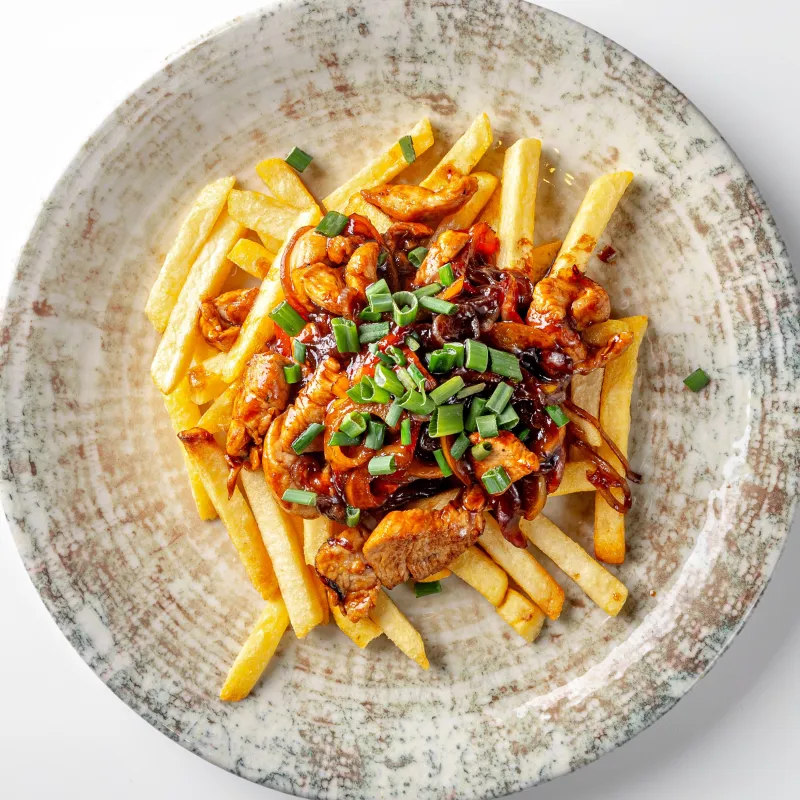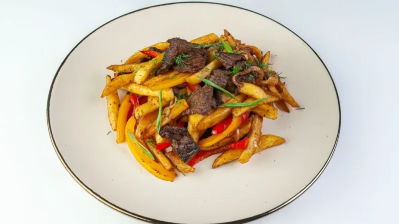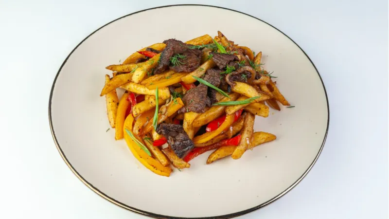 Говядина, перец светофор, лук, соевый соус, фри, специи