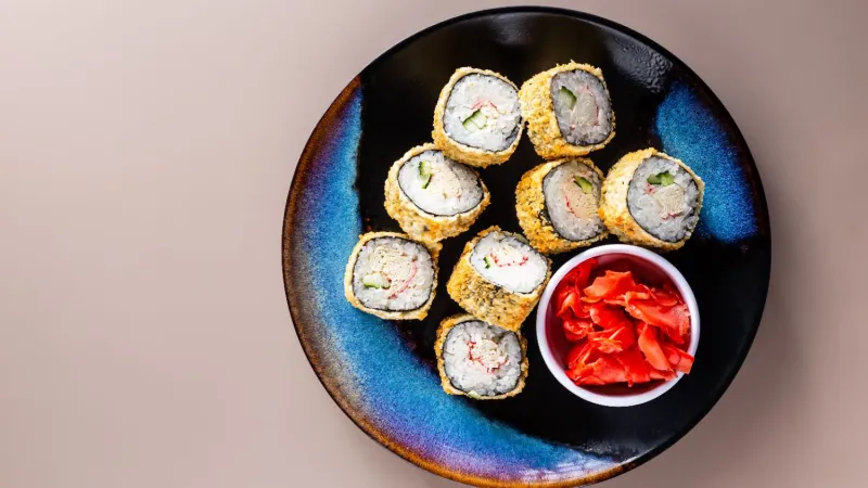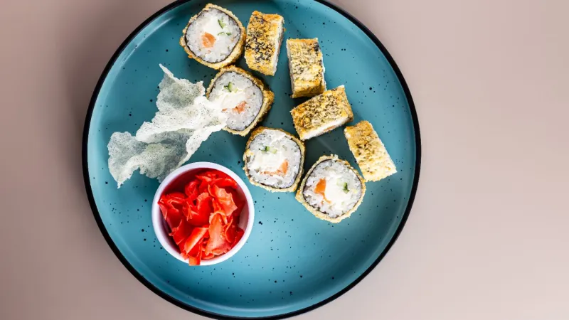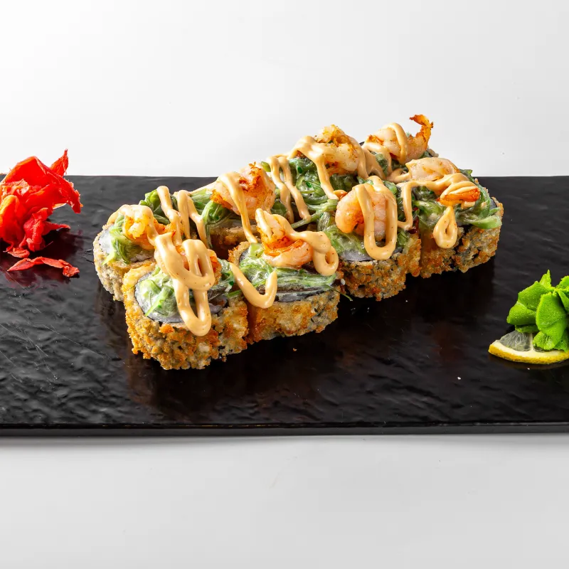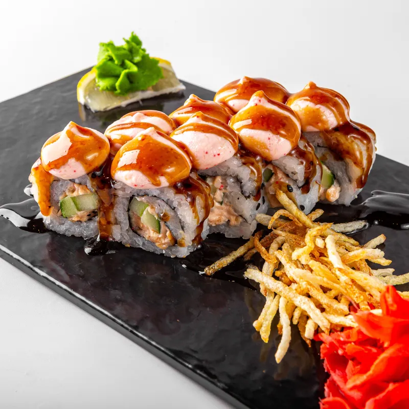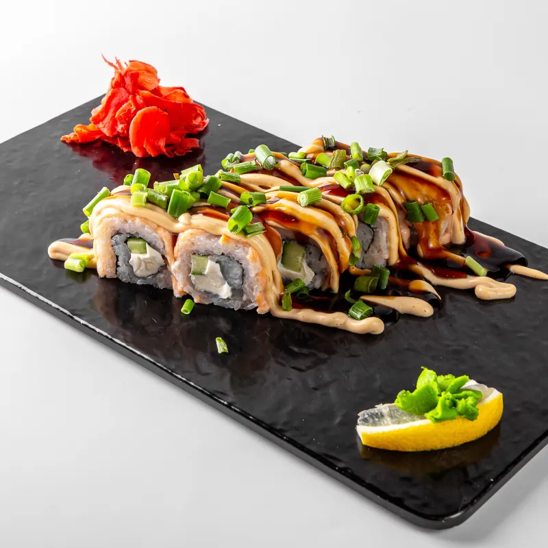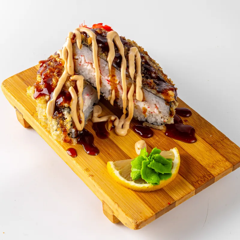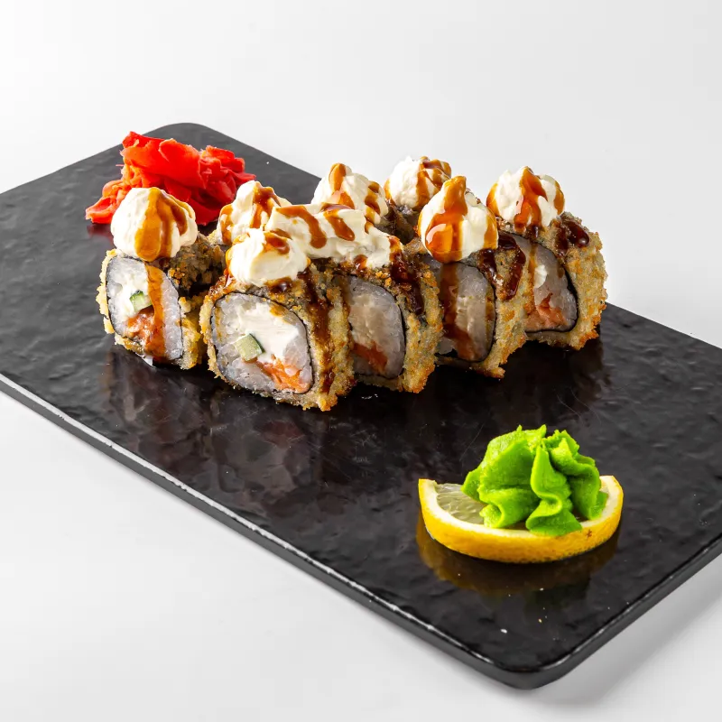 Лосось, огурец, творожный сыр, сливочный соус, соус терияки, нори, рис, кляр, сухари