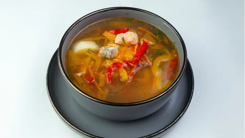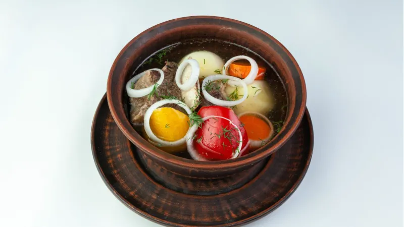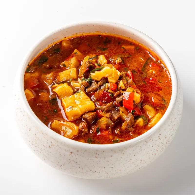 Говядина, картофель, морковь, лук репчатый, перец светофор, помидоры, зелень, бульон