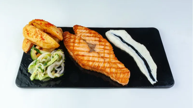 Семга, помидоры, лук зеленый, сливочный соус, сыр, маслины, зелень
