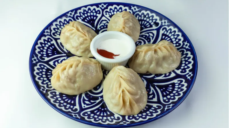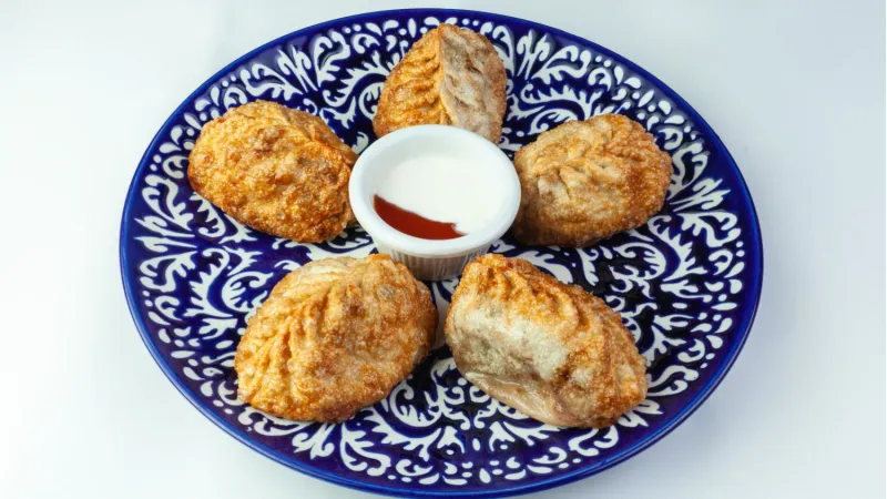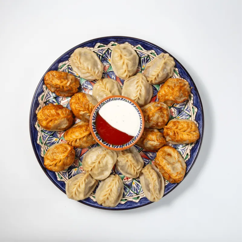 Манты 2 порции, манты жаренные 2 порции, чесночный соус, кетчуп