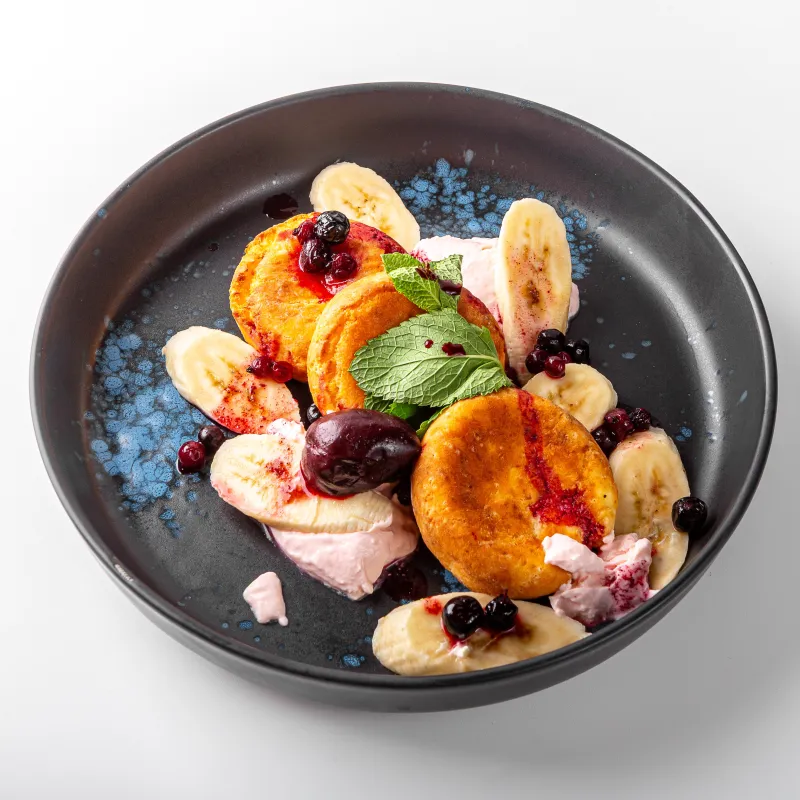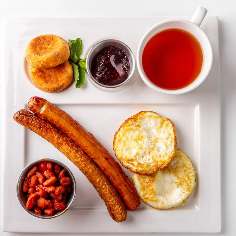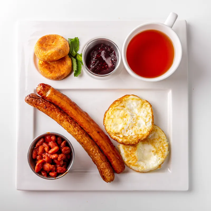 Яйцо, фасоль, колбаски куриные, сырники с джемом, черный чай
