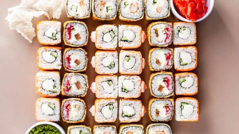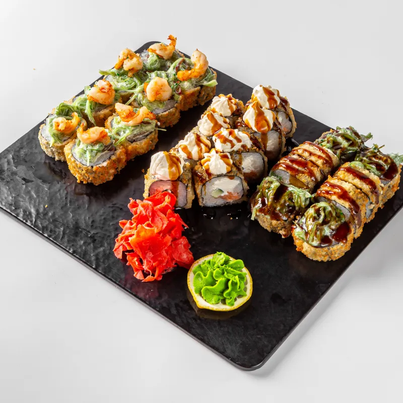Лосось, тунец, тигровые креветки, чука, кляр, сухари темпура, рис, нори, творожный сыр