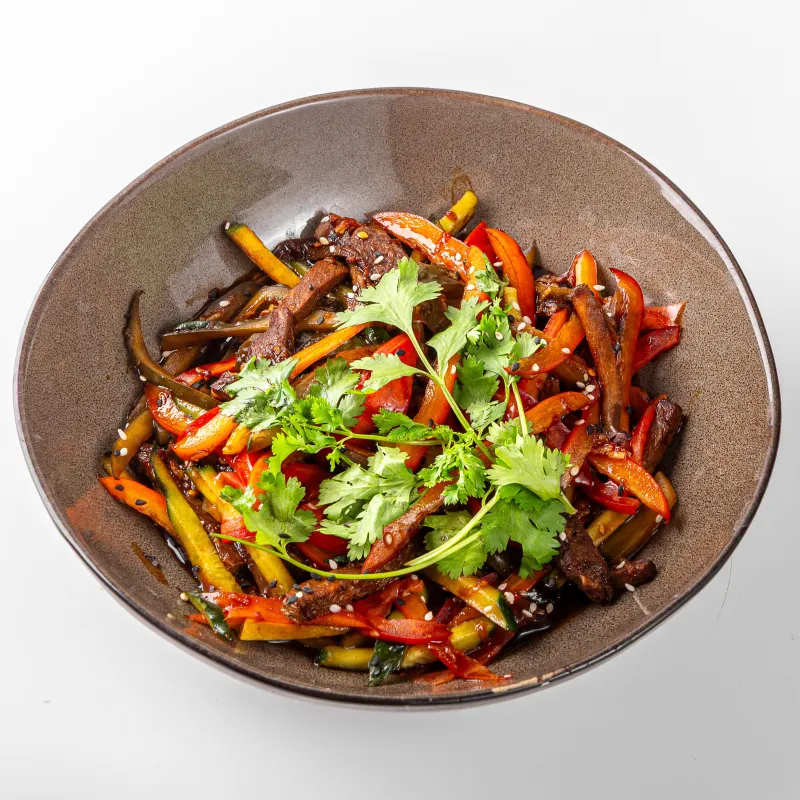 Обжаренная говядина, соленые огурцы, помидоры, перец светофор, чеснок, соус кориандровый соевый, бальзамический соус, кунжут