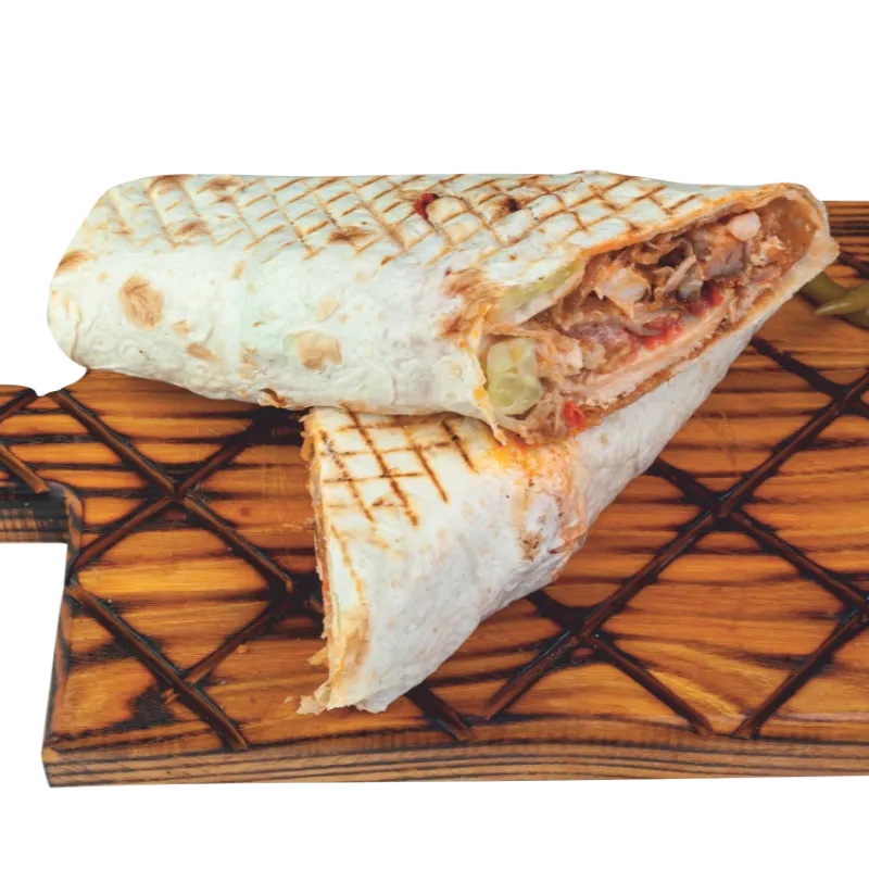 Курица, рис, маринованный лук, помидор, огурцы, лаваш