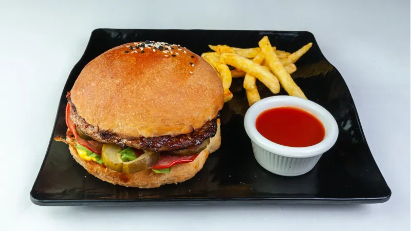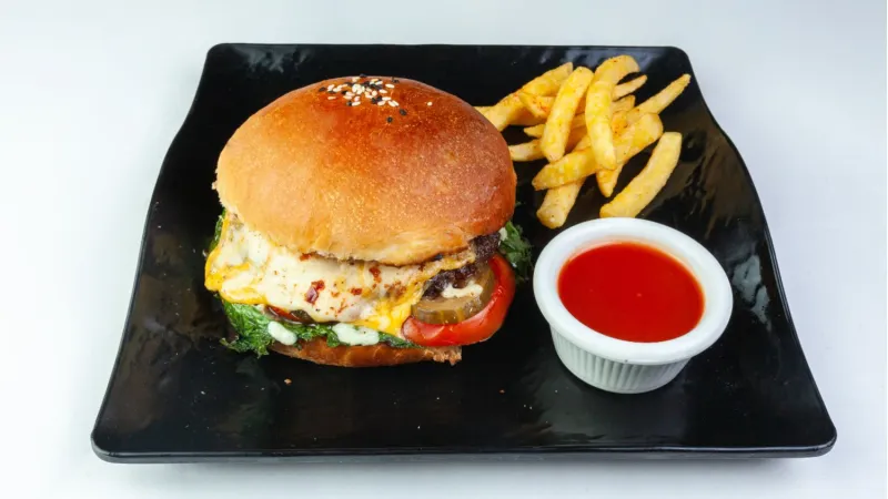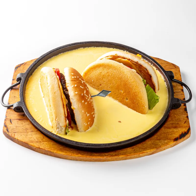 Говяжья котлета килиманджаро, куриная и говяжья котлета в панировке,фри, фирменный соус,