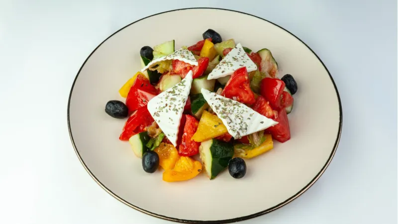 Помидоры, огурцы свежие, фетакса, маслины, масло оливковое, айсберг, орегано