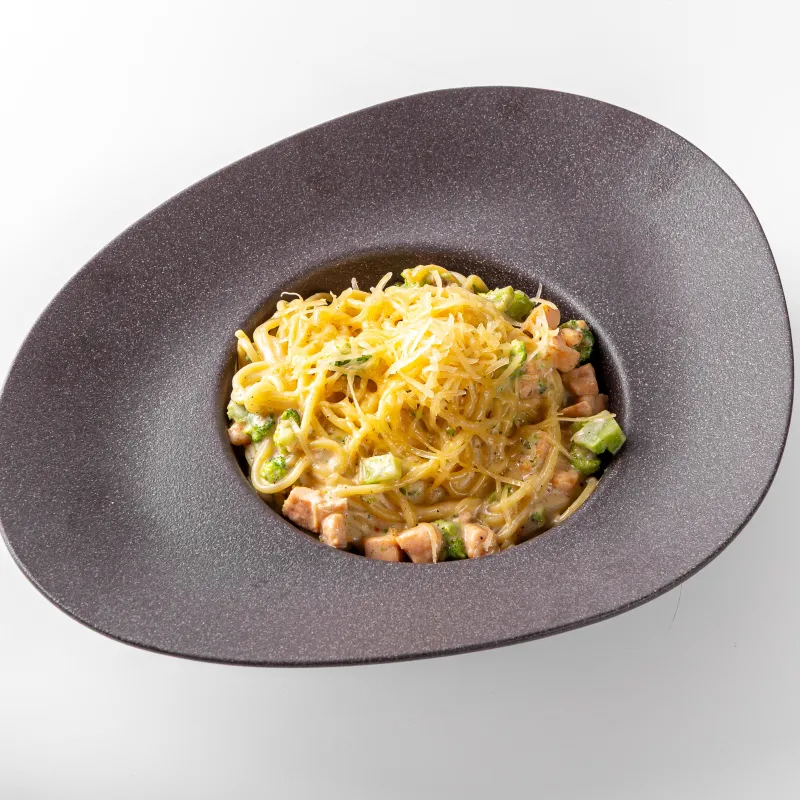 Семга, брокколи, спагетти, сыр пармезан, сливочный соус