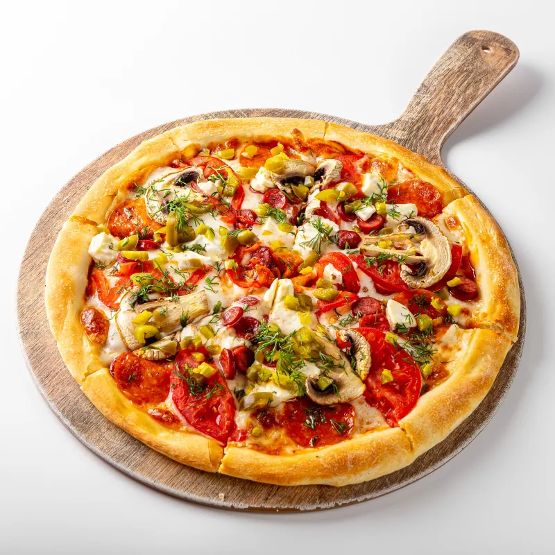 Колбаса, охотничьи колбаски, грибы, помидор, соус, сыр, перец болгарский, острый перец халапеньо