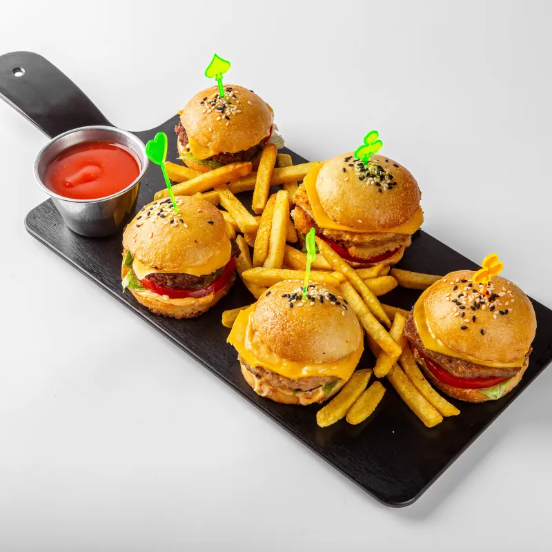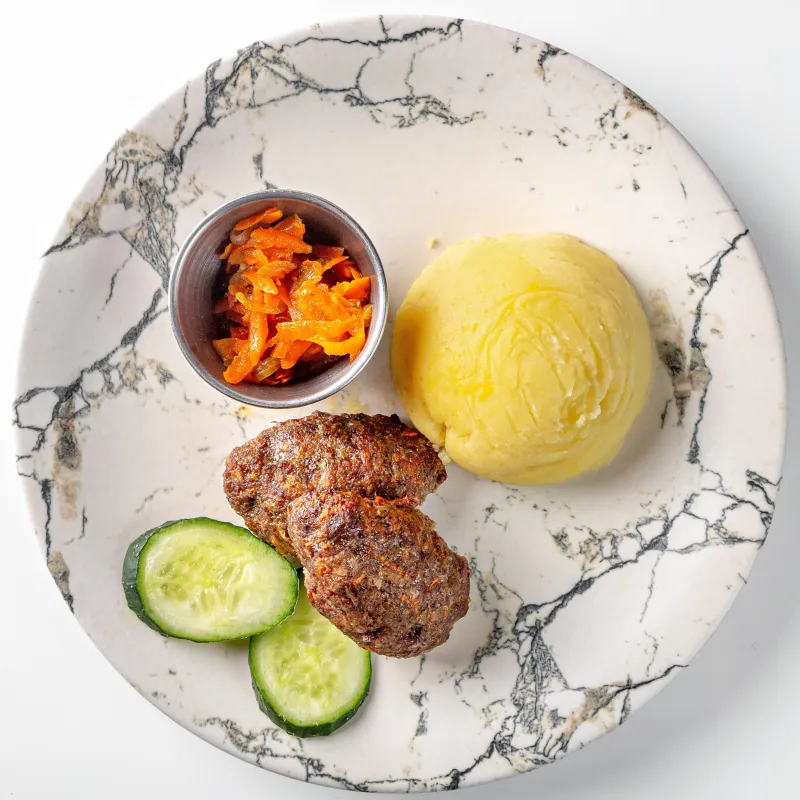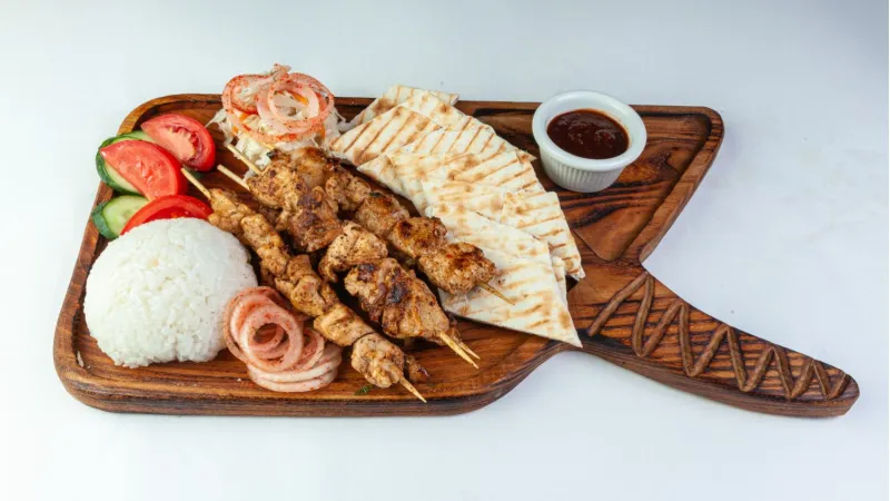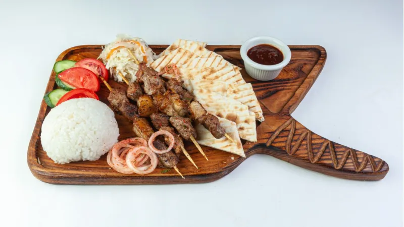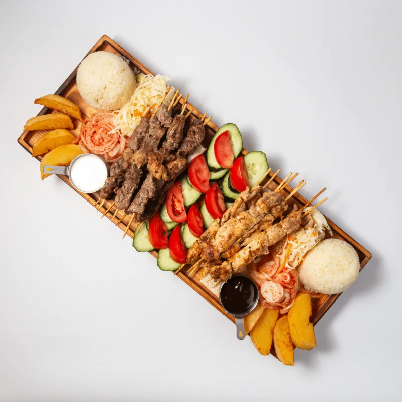 Куриный чоп-чиш 2 порции, баранина чоп-чиш 2 порции, огурцы, помидор, рис 2 порции, картофельные дольки 2 порции, квашеная капуста, маринованный лук, чесночный соус, барбекю соус