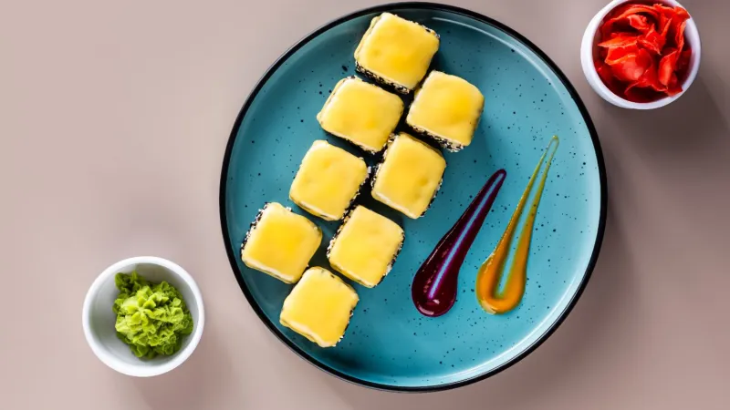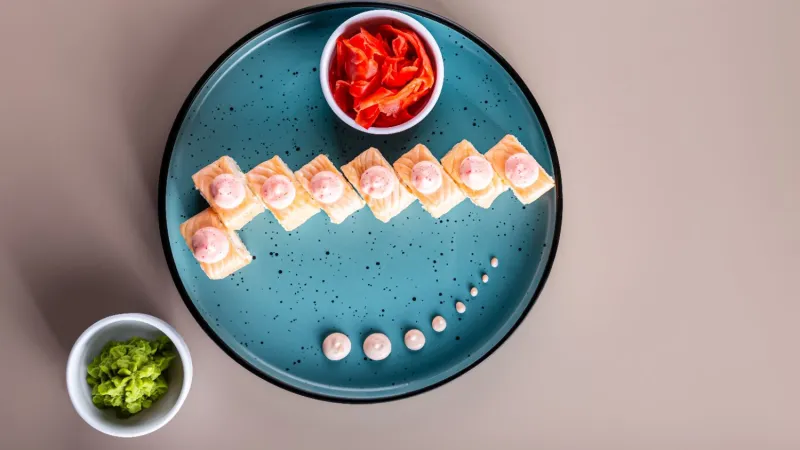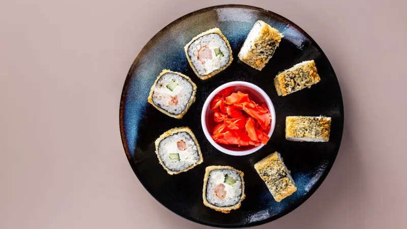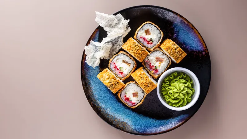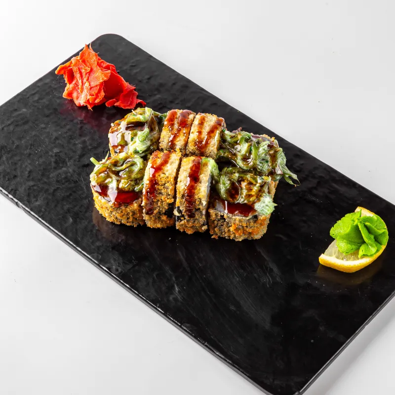 Чука, рис, нори, семга, угорь, кляр, сухари темпура, соус спайси
