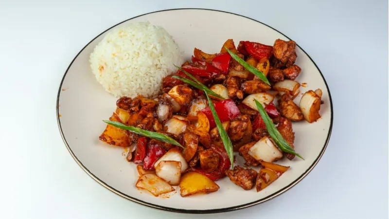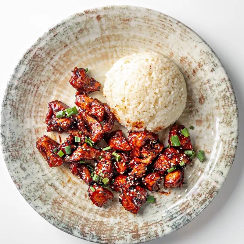 Куринное филе, кисло сладкий соус, рис, кунжут