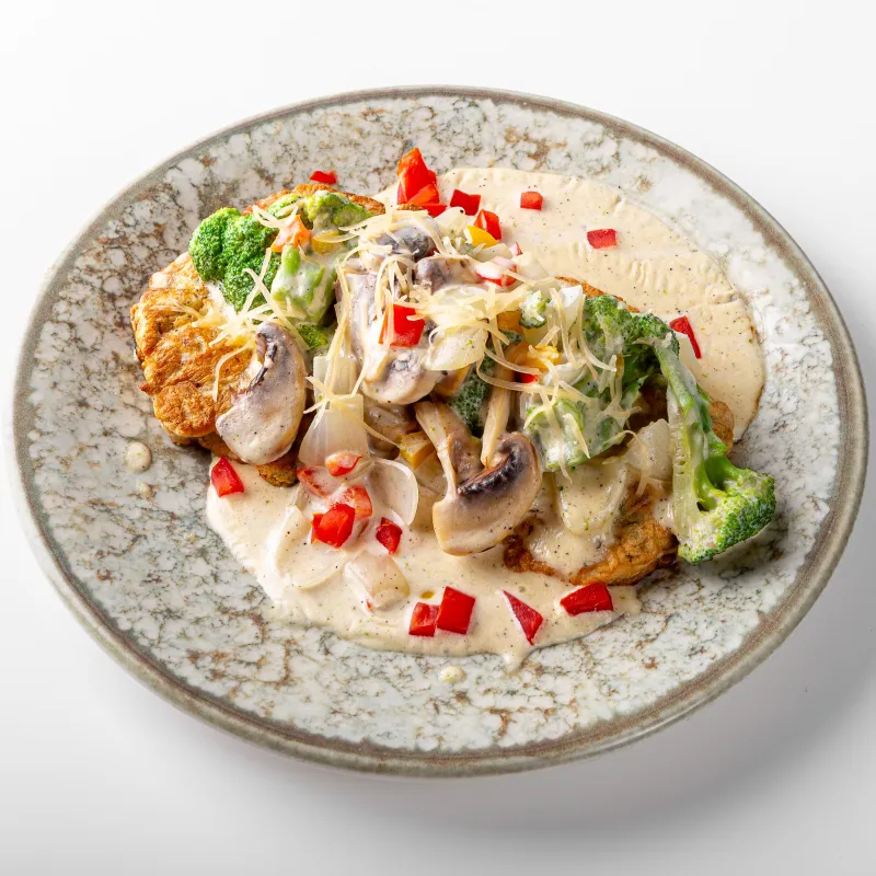 Куриное филе, яйцо, мука, майонез, грибы, перец болгарский, сливки, брокколи