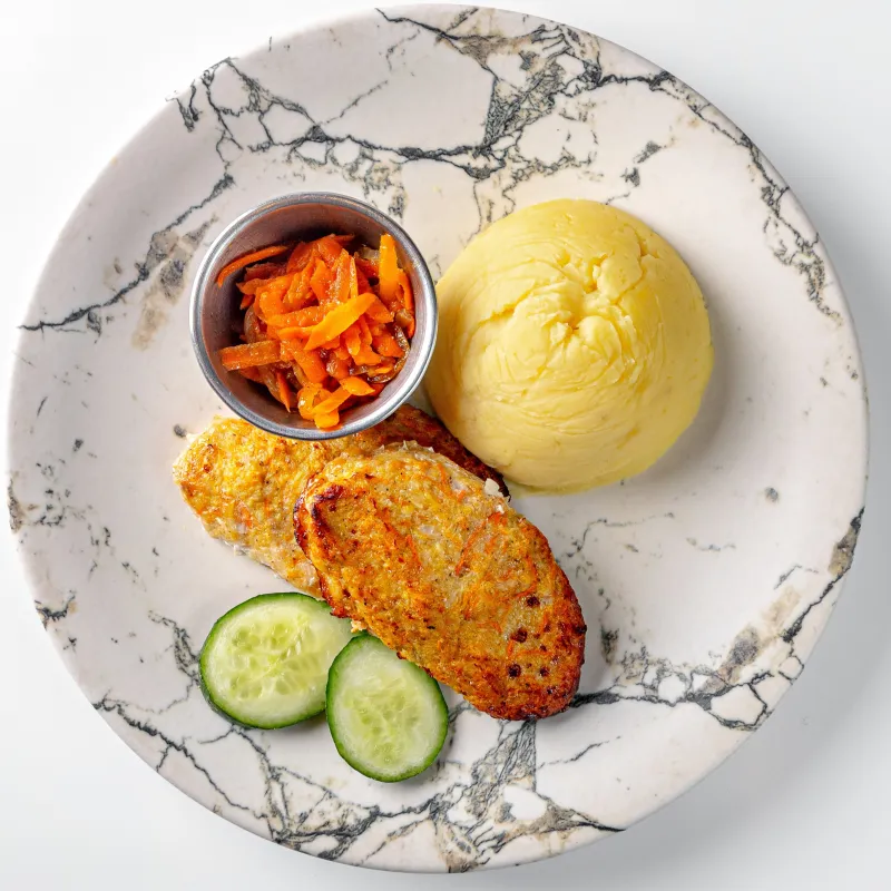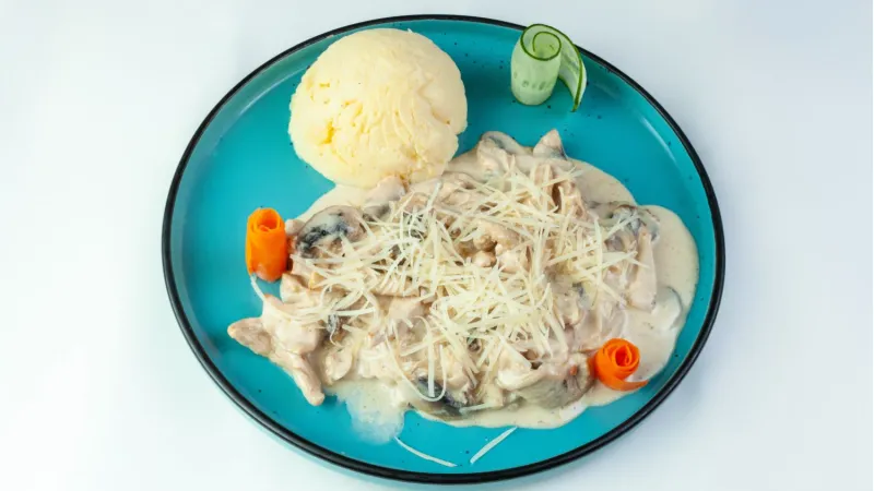 Куриное филе, шампиньоны, лук, сливочный соус, пюре, сыр пармезан