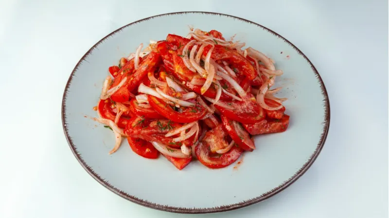 Куски баранины, рис, маринованный лук, помидор, огурцы, лаваш