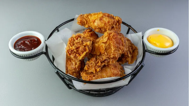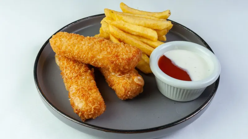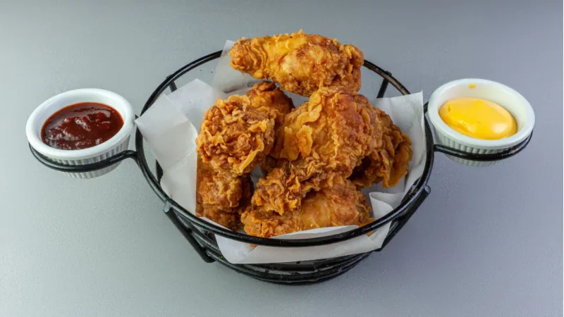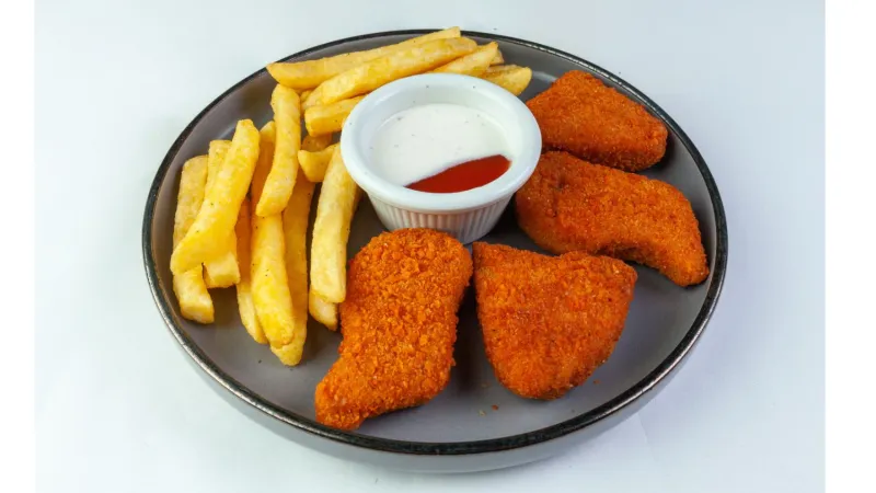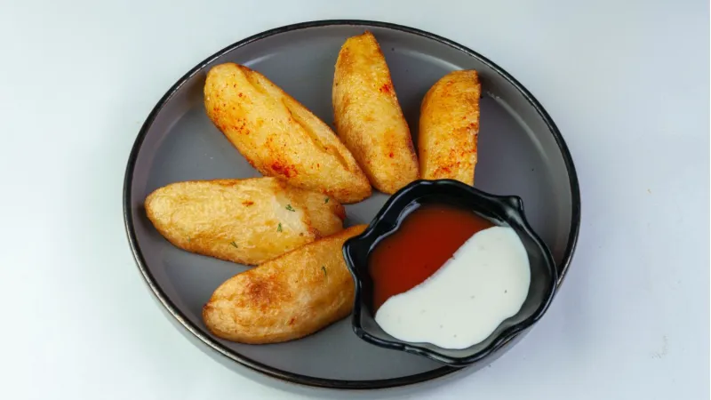 Куриное мясо 100 гр, сырный соус, картофель пай, соленые огурцы, соус