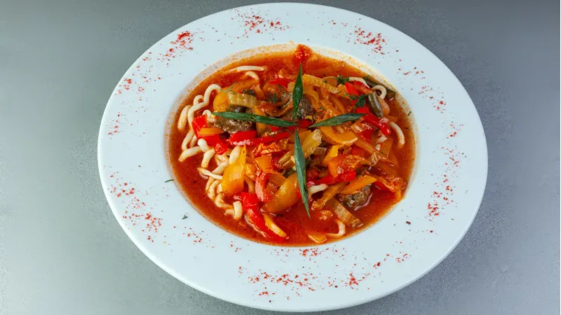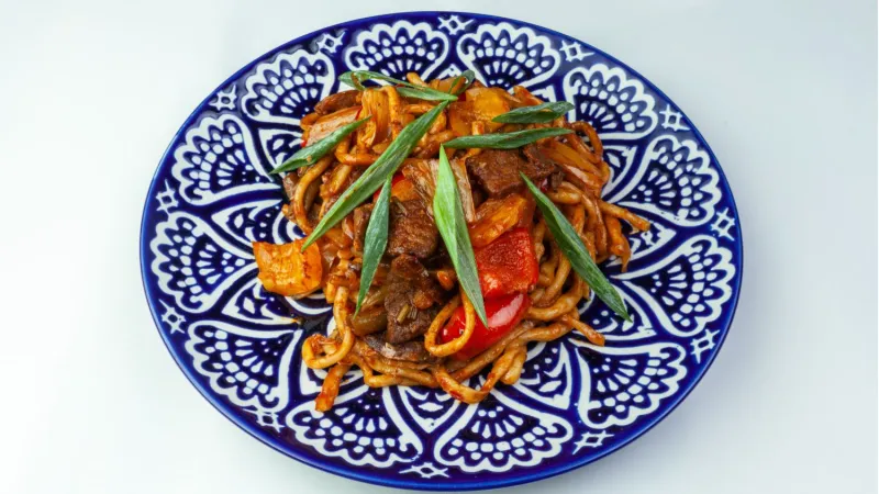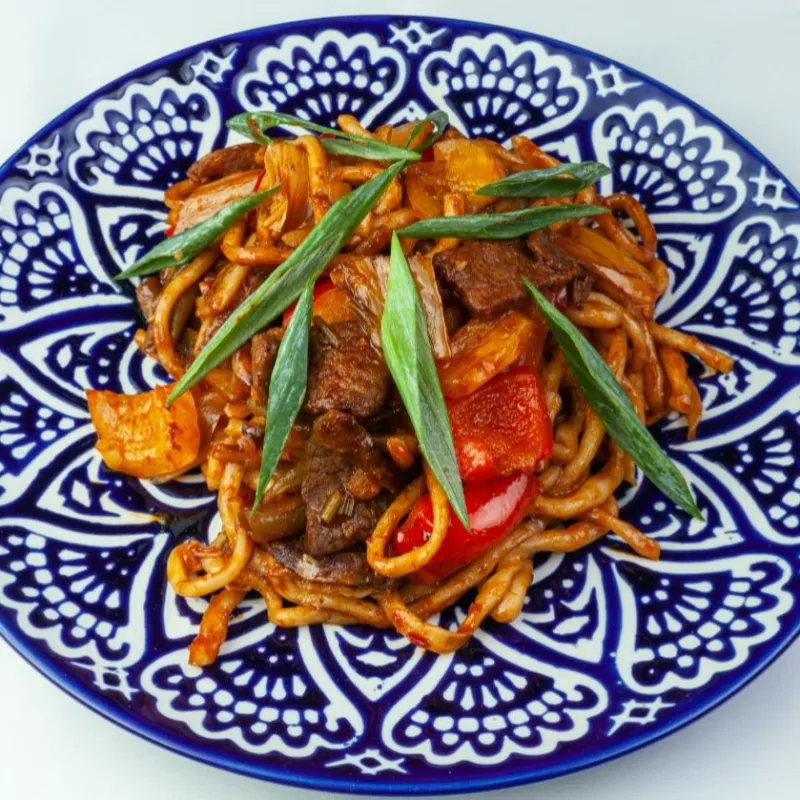 Говядина, лагман, перец светофор, сельдерей, лук, томат, пекинская капуста, стручковая фасоль, кинза, специи