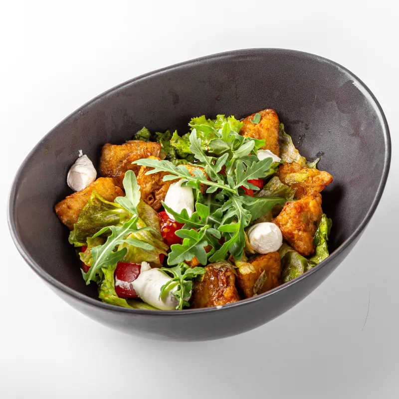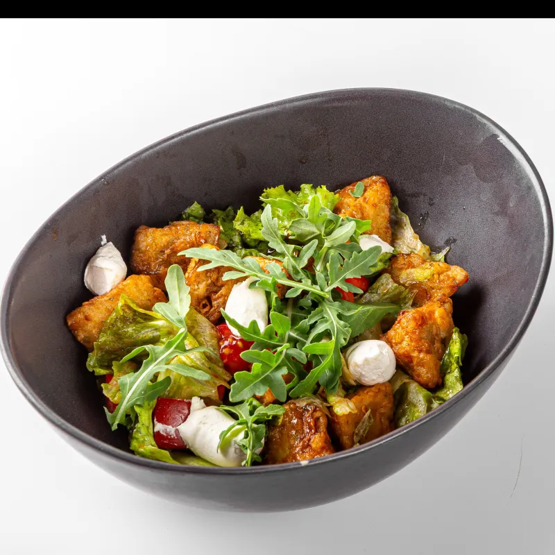 Баклажан, помидоры, руккола, айсберг, лист салата, творожный сыр, соус паназиатский