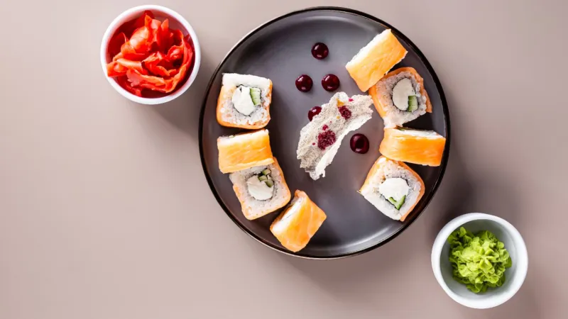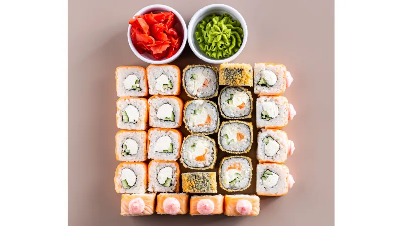 Семга, рис, нори, тунец, угорь, японский соус, соус терияки, лук зеленый