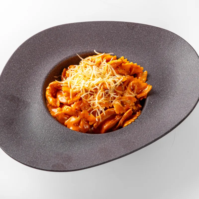 Куриное филе, грибы, томат, фарфалле, сыр пармезан, сливочный соус
