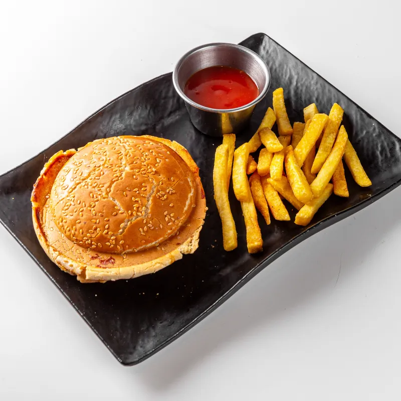 Говяжья котлета, яйцо, лист салата, помидор, огурцы свежие, сыр чеддер, фирменный соус, картофель фри