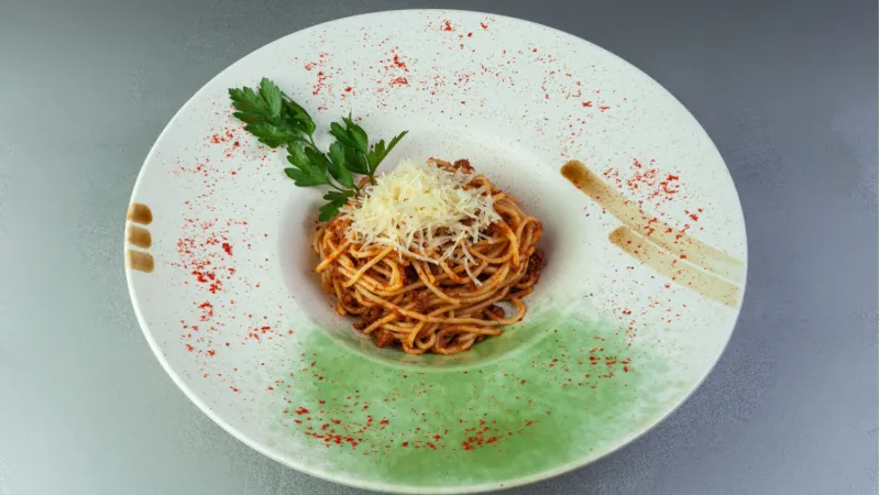 Говяжий фарш, помидоры,лук, морковь, сельдерей, соус, спагетти, пармезан