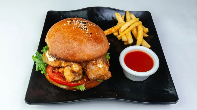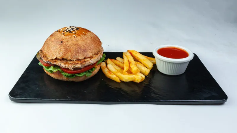 Куриная котлета, помидор, сыр, огурцы, айсберг, фирменный соус, фри