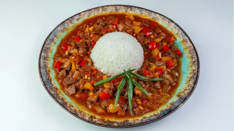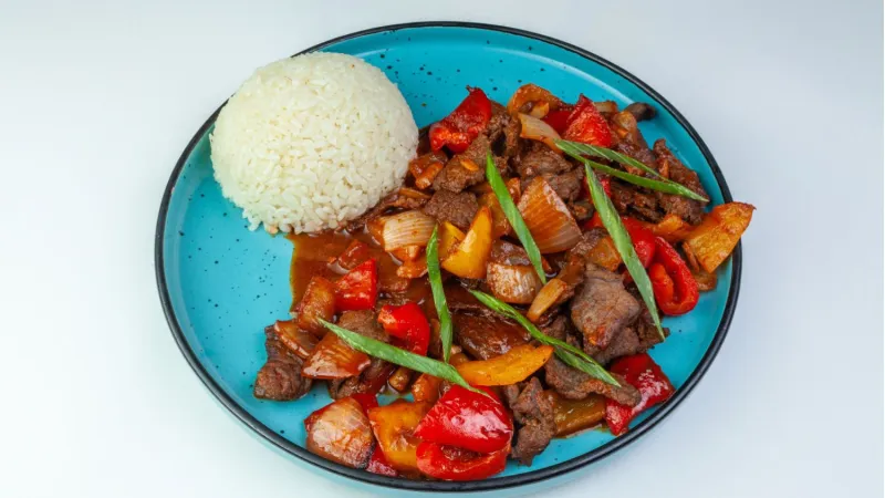 Говядина, перец светофор , помидоры, чеснок, рис, соевый соус, томат