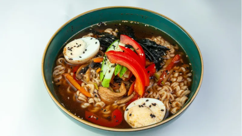Лапша, куриное филе, нори, огурцы свежие, кунжут, кабачки, помидоры, соевый соус, морковь, перец светофор, шампиньоны, яйцо