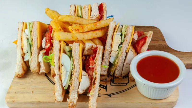 Хлеб тостерный, лист салата, сыр, помидор, куриное филе, вареное яйцо, огурцы свежие, фри, фирменный соус