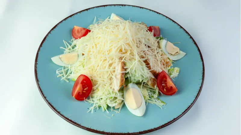 Куриное филе, яйца, сухари, помидоры, айсберг, пармезан, соус цезарь