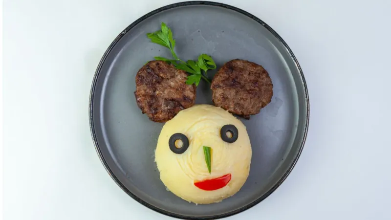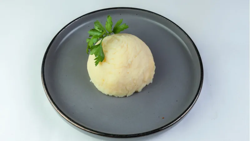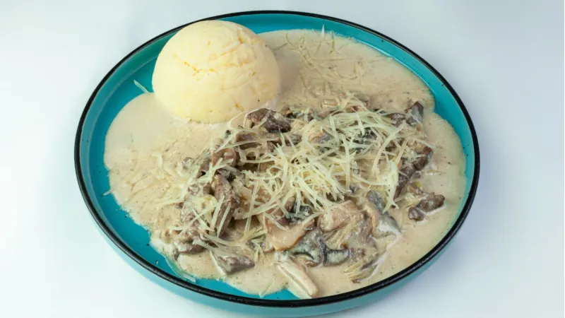 Мясо говядины, шампиньоны, лук, чеснок, сливочный соус, пюре, сыр пармезан