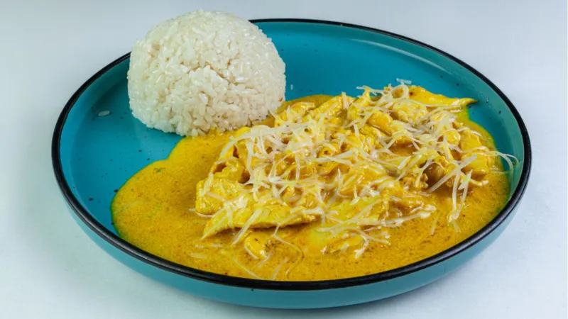 Куриное филе, лук репчатый, сливки, рис, соус карри, сыр пармезан