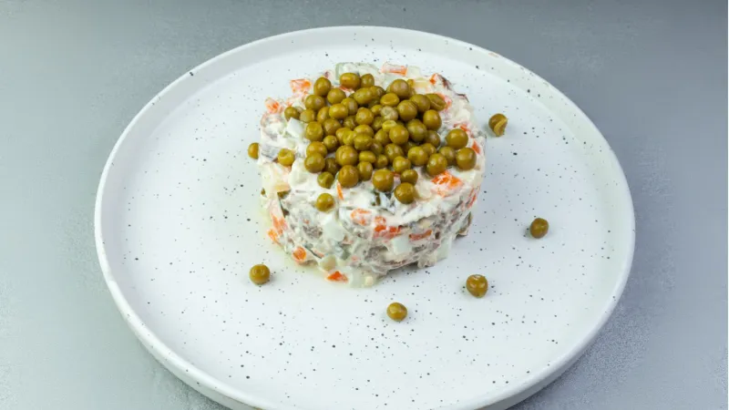 Картофель, яйца, говядина, морковь, горох, соленые огурцы, майонез, зелень