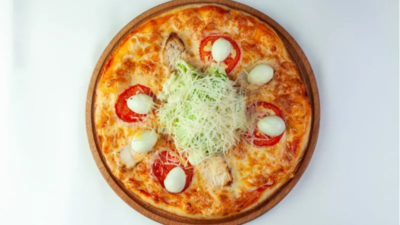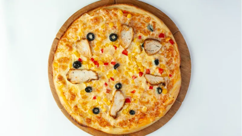 Куриное филе, перец светофор, кукуруза, сыр, маслины, пицца соус