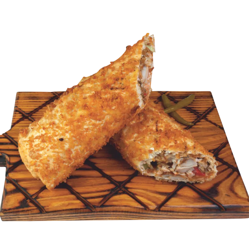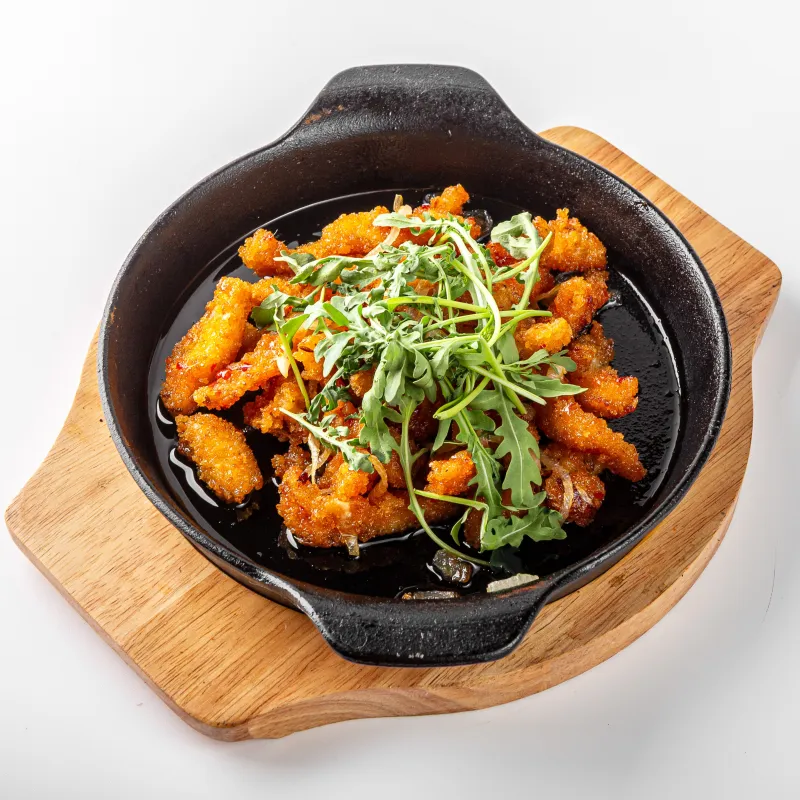 Куриное филе, лук, специи, зира, соус свит чили, черри помидор ,зелень, сухари панировочные