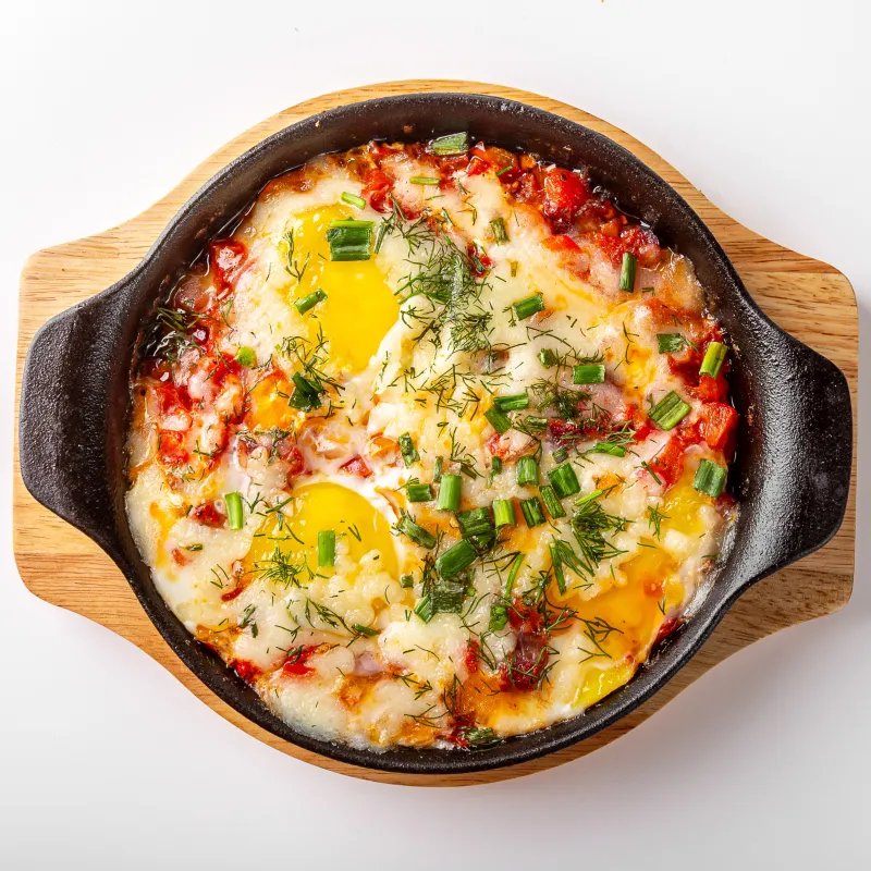 Яйцо, томаты, говяжья ветчина, лук, перец болгарский, сыр, зелень