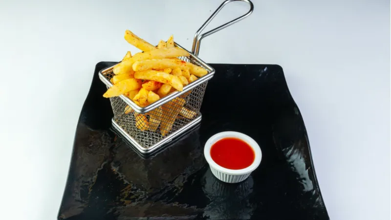 Куринное филе, перец светофор, лук, соевый соус, соус терияки, фри, специи